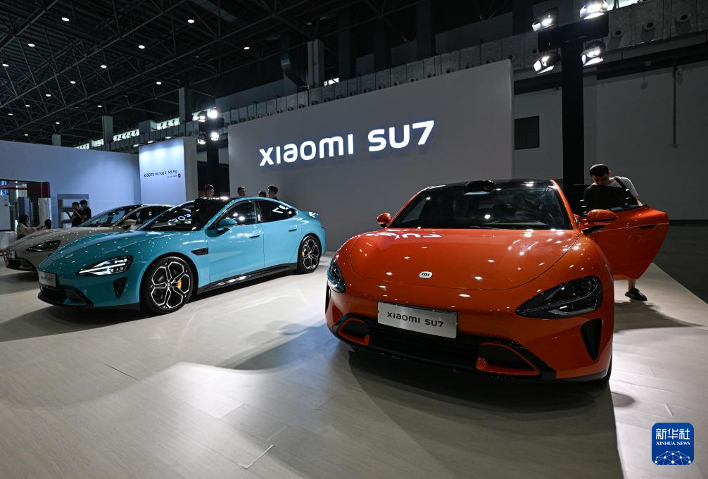 9月16日在车展上小米汽车展台拍摄的“xiaomi SU7”。