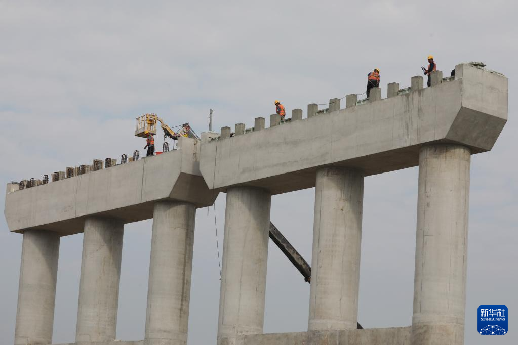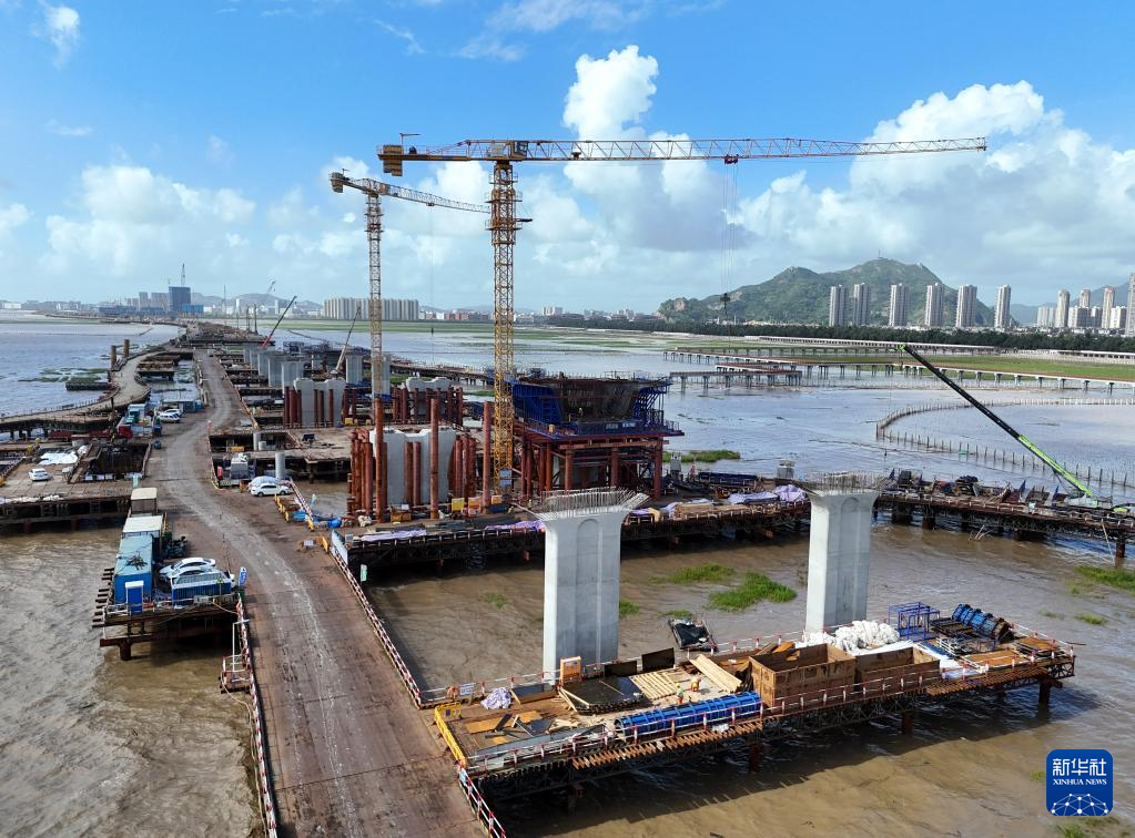 9月17日,在浙江省温州市乐清湾滨海大道桥梁建设现场,工人在项目工地施工(无人机照片)。