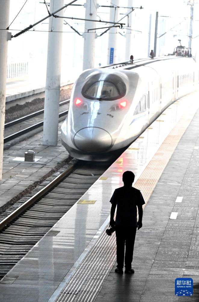 9月17日,客运工作人员在河北石家庄火车站站台目送列车离站。