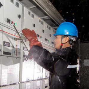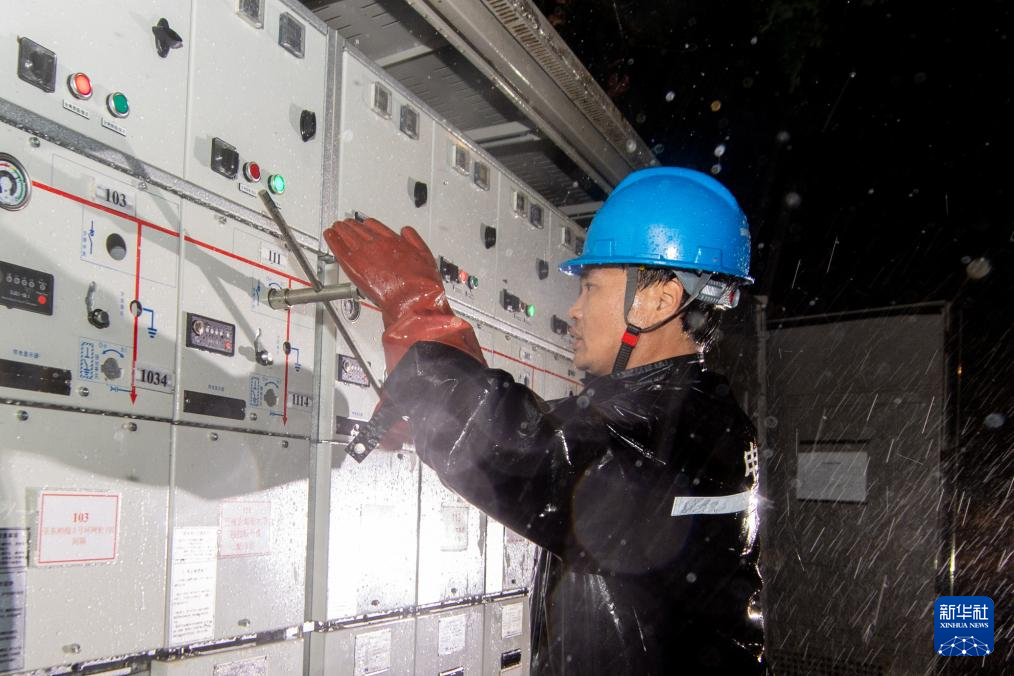 9月17日凌晨,国网南京供电公司工作人员在10千伏东柏线抢修台风“贝碧嘉”损毁线路。
