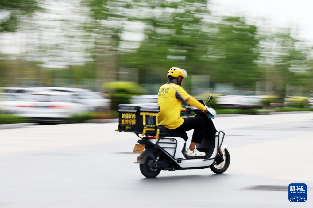 9月17日,在山东省临沂市郯城县郯城街道,一名外卖小哥为顾客送餐。