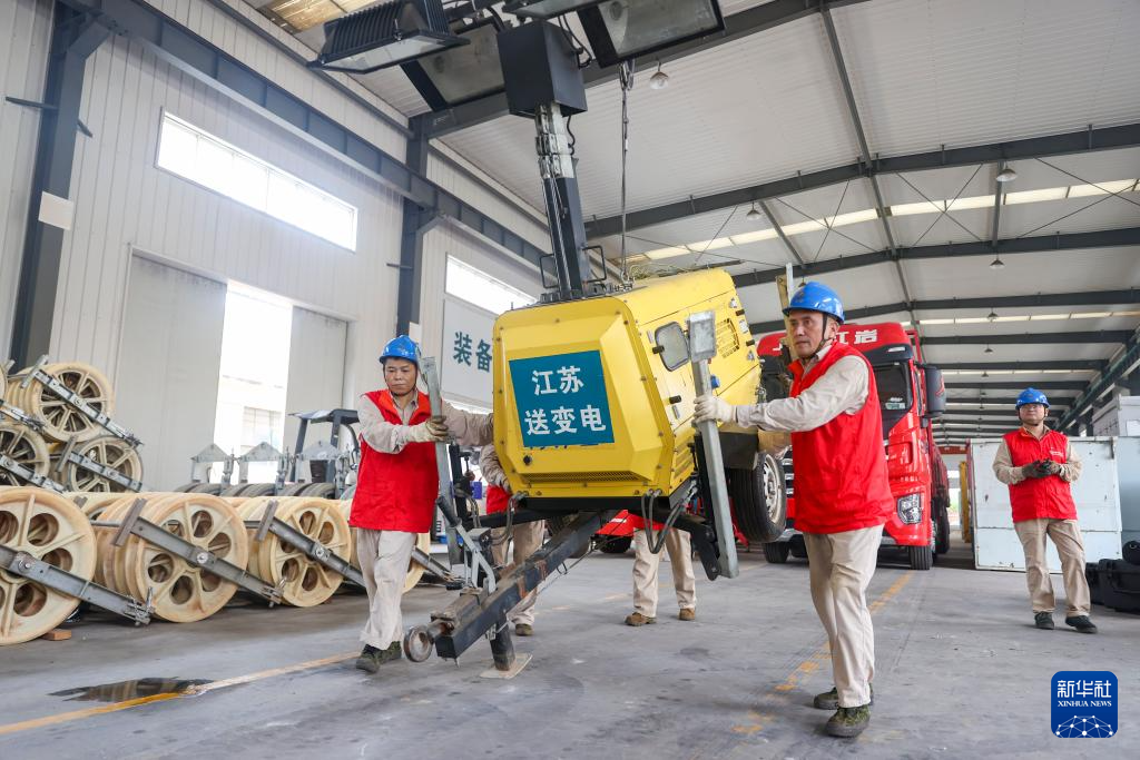 9月17日,在江苏省南京市栖霞区的国网江苏电力应急抢修中心基地,电力工人搬运设备,准备抢修被台风“贝碧嘉”损毁的电网。