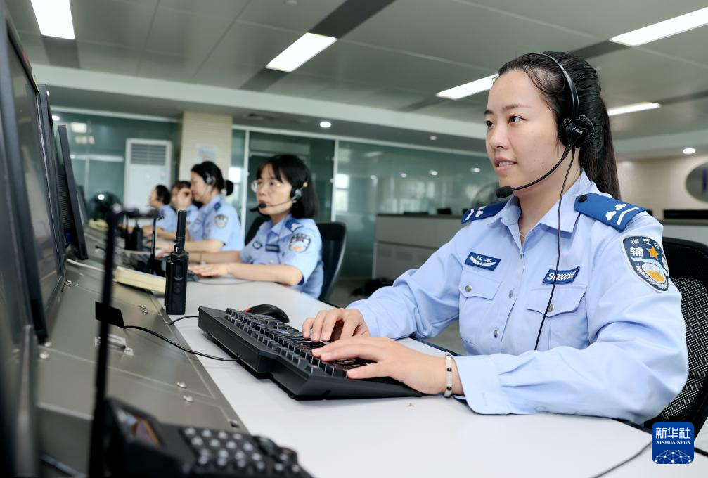 9月17日,江苏省宿迁市公安局110报警服务台辅警在接听群众求助电话。