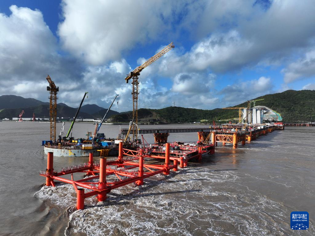 9月17日上午,建设者在甬舟铁路工程西堠门公铁两用大桥金塘岛侧的海上4号主墩建设现场施工(无人机照片)。
