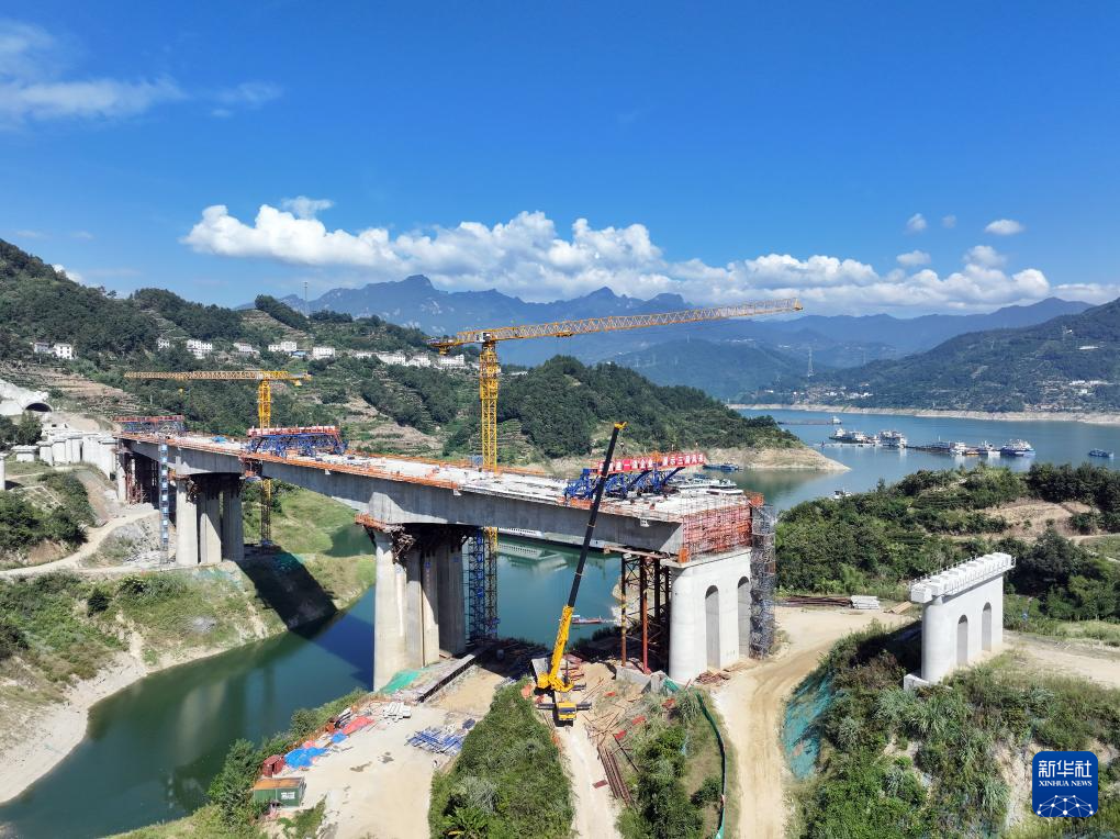 9月17日,建设者在湖北省宜昌市秭归县茅坪镇的三峡枢纽茅坪港疏港铁路工地施工(无人机照片)。