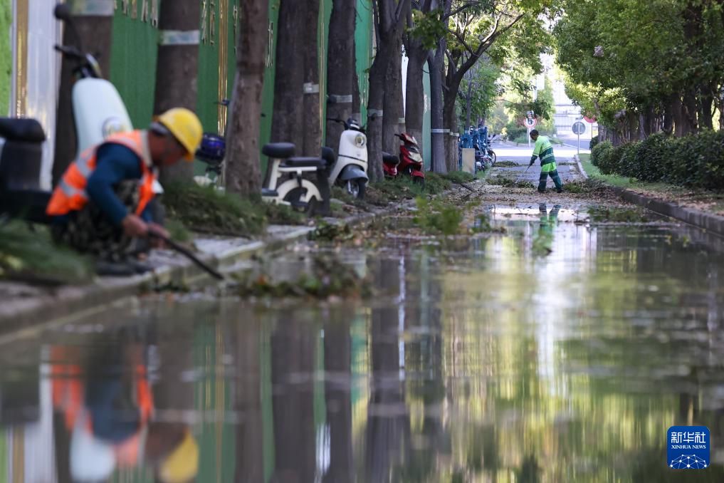 9月17日,在江苏无锡,环卫工人在中建二局无锡奥体三期项目旁道路上清理积水,确保台风过后城市尽快恢复正常秩序。