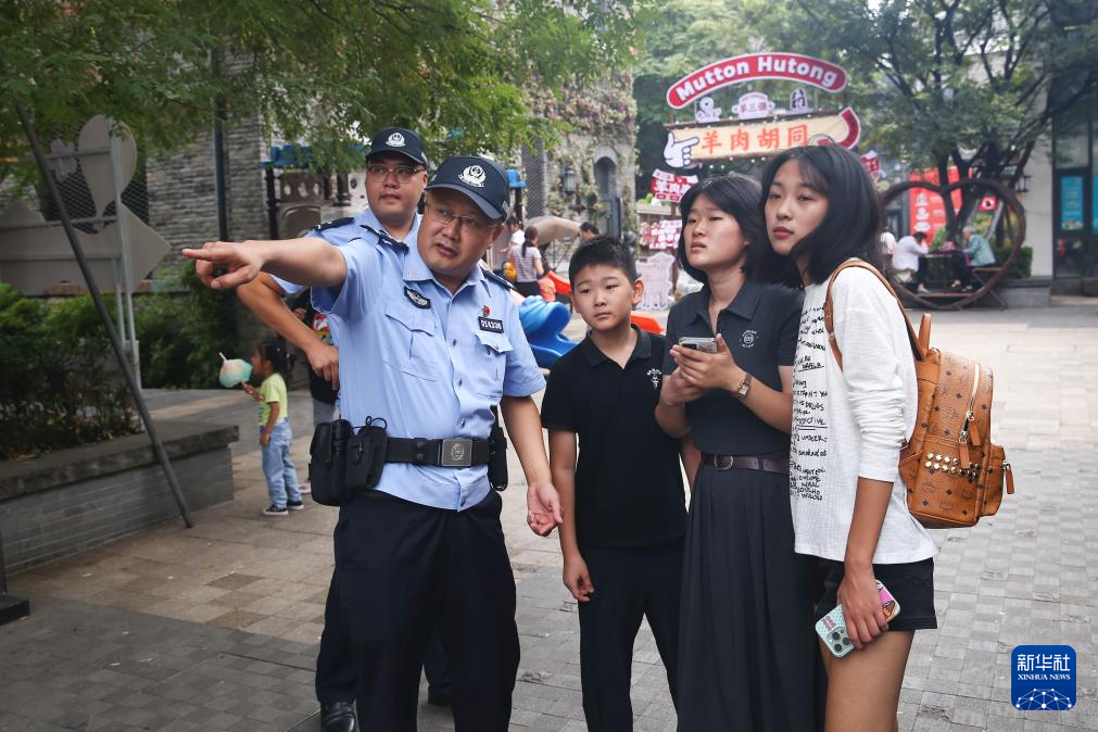 9月17日,山东省济南市公安局市中区分局大观园派出所民警在老商埠区景区巡逻执勤,为游客提供服务。