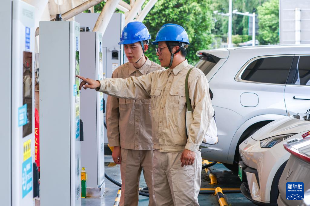 9月17日,在位于江苏省扬州市江都区的启扬高速瘦西湖服务区,工作人员在检查充电桩运行状况。