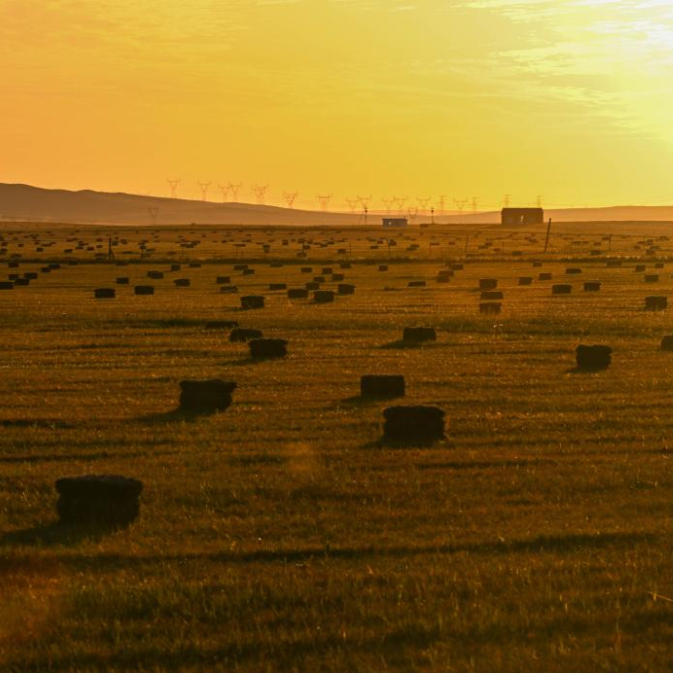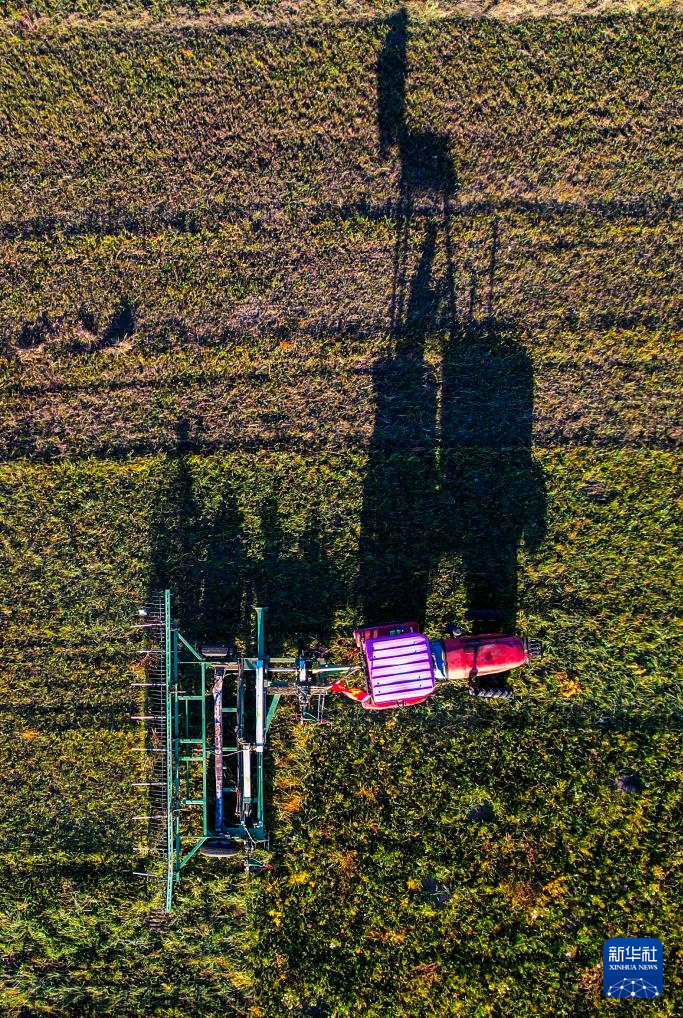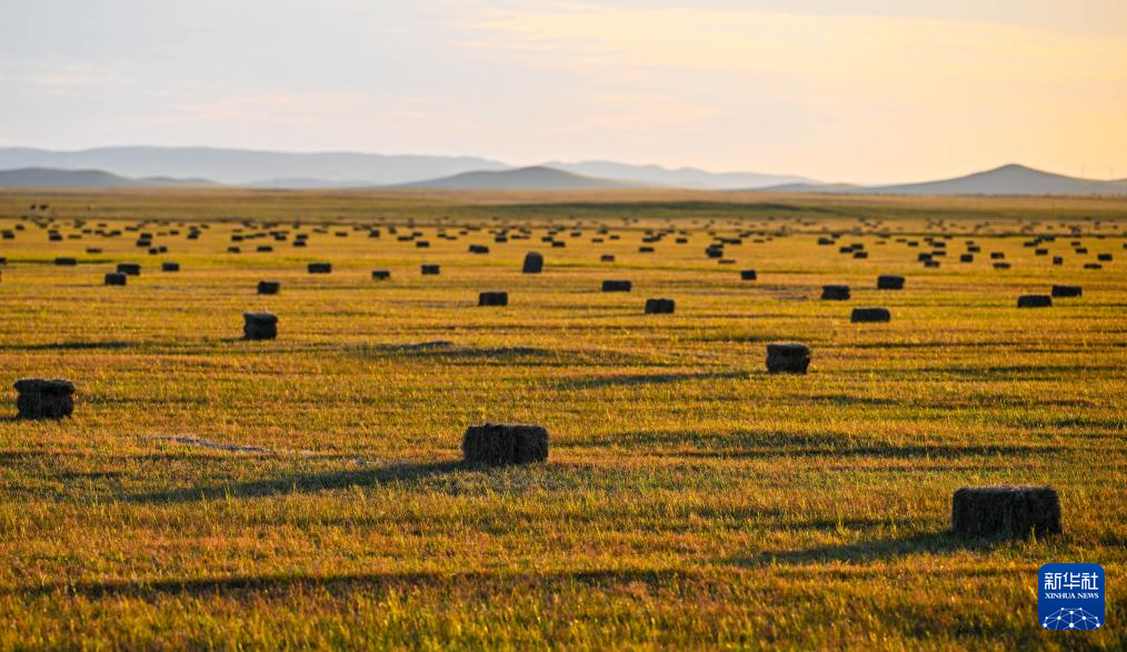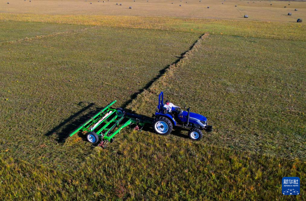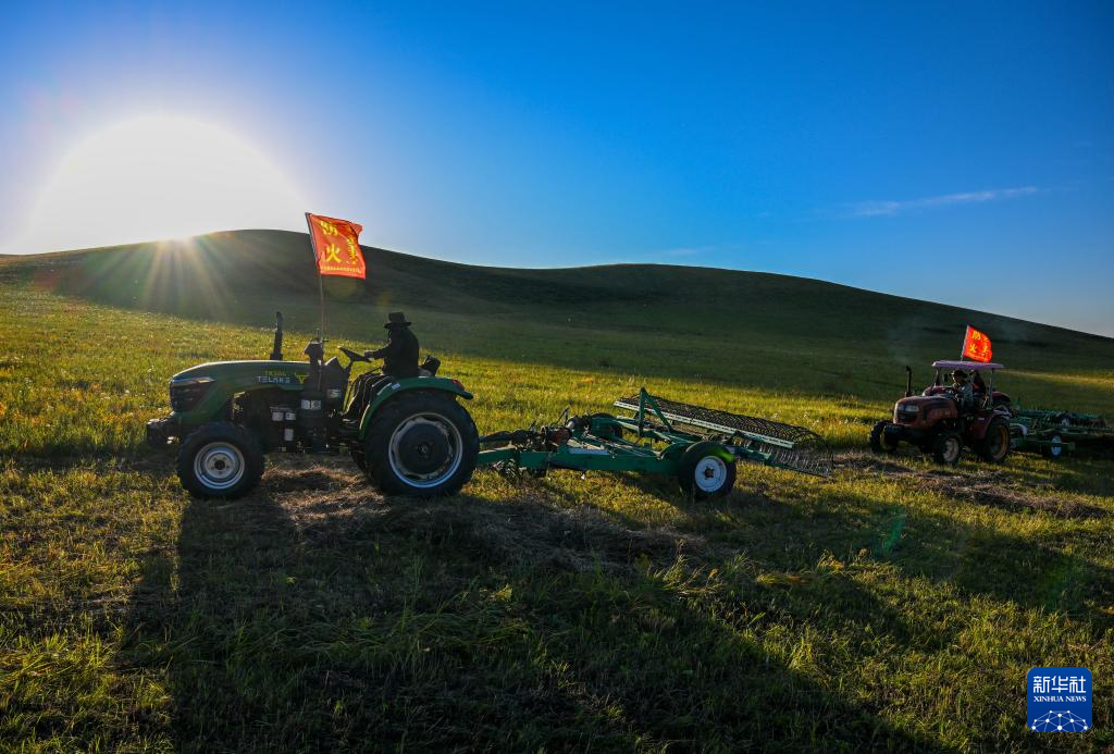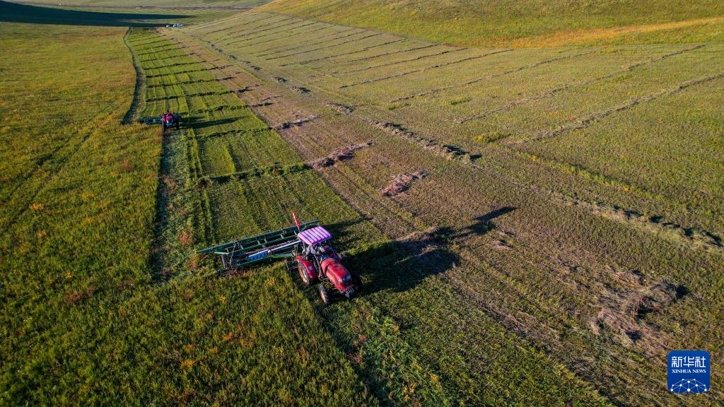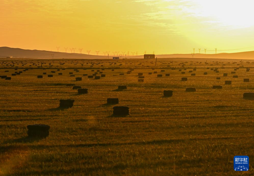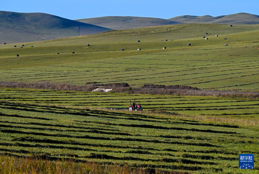 金秋时节,内蒙古锡林郭勒草原进入打草季,草原上的牧民忙着将牧草收获打捆。