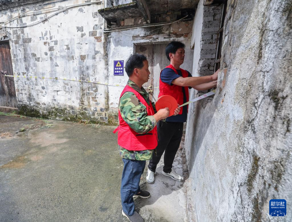 9月19日,浙江省诸暨市赵家镇泉畈村村干部和党员志愿者在台风来临前排查危旧房安全隐患,安装警示标识,提醒周边村民注意安全。