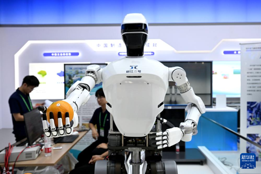 9月20日,在2024世界制造业大会上,一款机器人抓取橙子递给参观者。