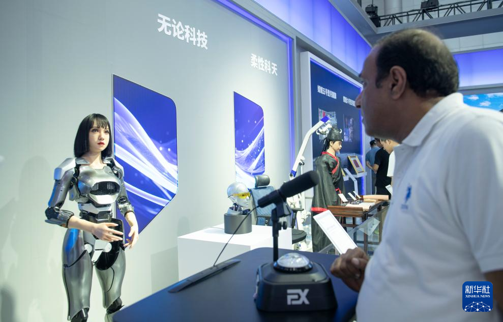 9月20日,观众在2024世界制造业大会展馆内与一款交互性仿生人形机器人互动。
