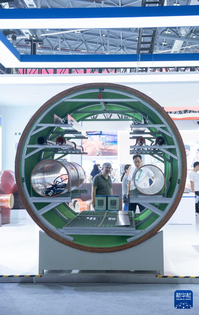 9月20日,观众在2024世界制造业大会展馆内了解一款竹缠绕管廊。
