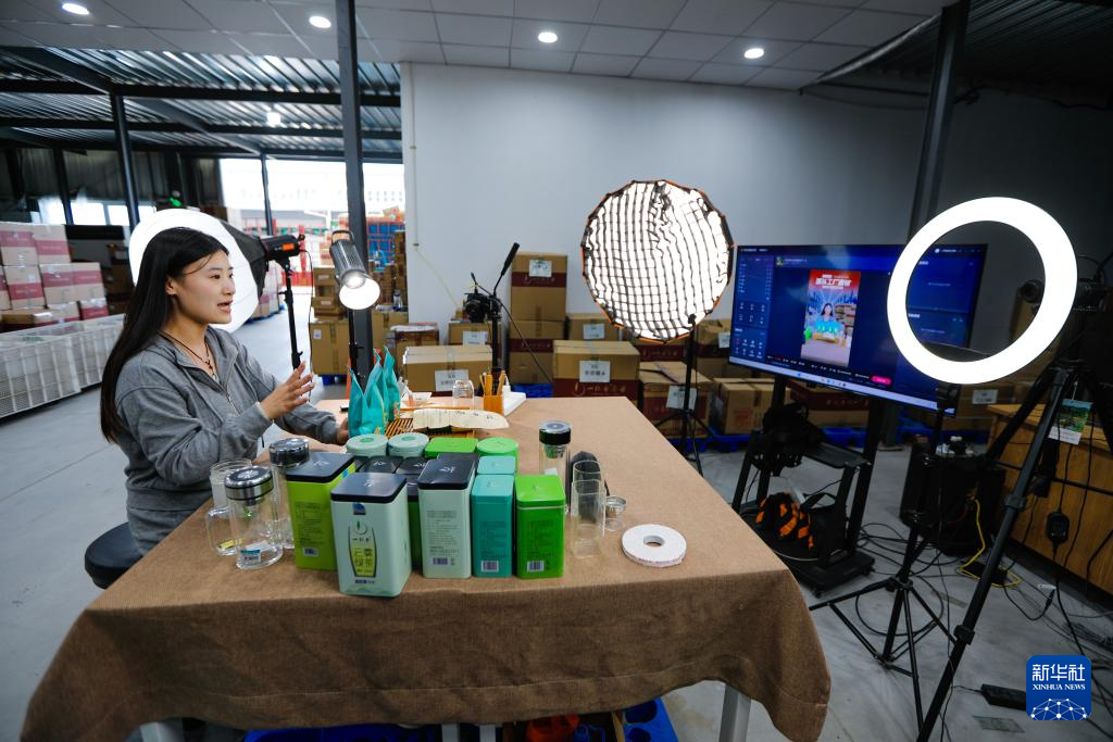 9月21日,在山东滕州传化公路港内,一家茶叶企业员工在直播带货。
