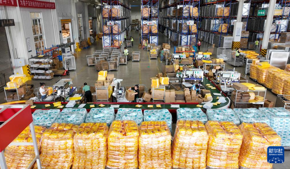 9月21日,在山东省滕州市爱拉森医用品有限公司云仓,工人们在打包分拣货物(无人机照片)。