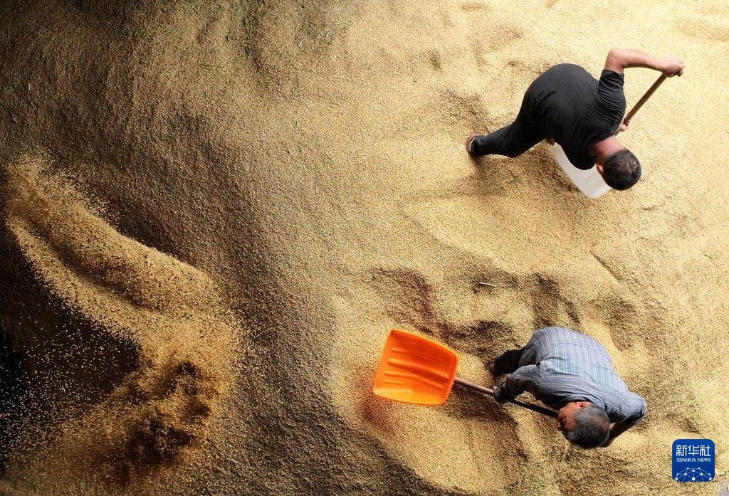 9月20日,村民将收割后的水稻进行烘干(无人机照片)。
