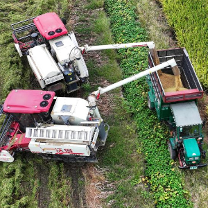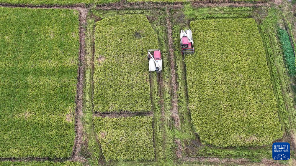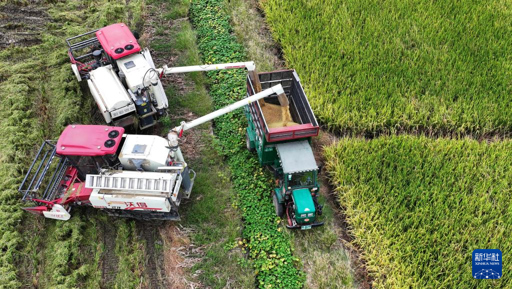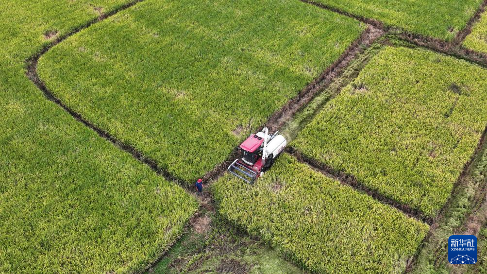 9月20日,在湖南省常德市澧县澧阳平原上,村民驾驶收割机收割水稻(无人机照片)。