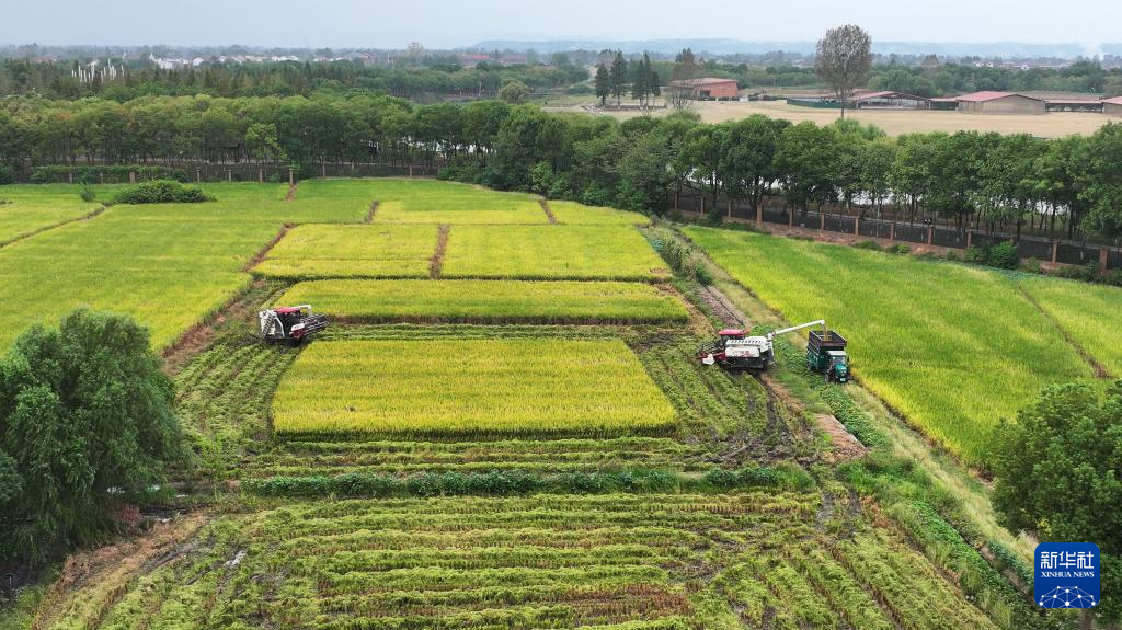 中国农民丰收节即将来临,国家商品粮基地县湖南省常德市澧县澧阳平原上稻浪翻金,村民驾驶收割机收割水稻。澧阳平原日照充足,水量丰富,气候温暖,土壤肥沃,为水稻提供了适宜的生长环境。这里现存的彭头山、八十垱、城头山、鸡叫城等稻作遗址,记录着先民们勤于稻作的历史。