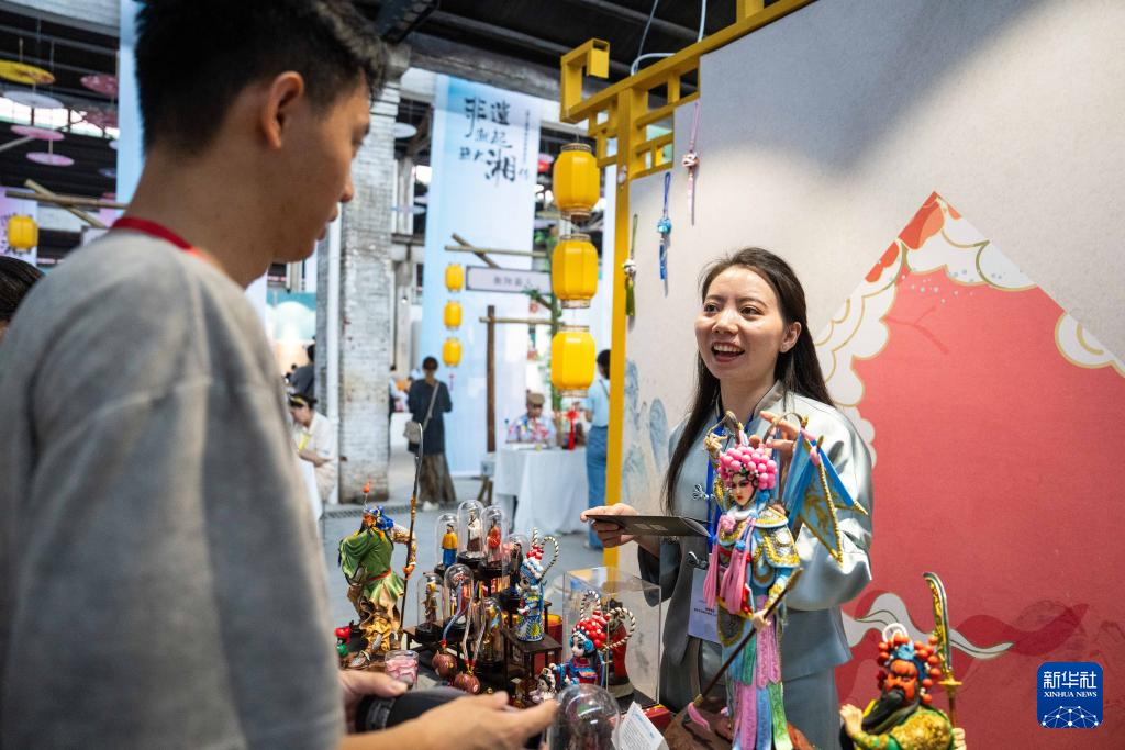 9月21日,在第三届湖南非遗博览会上,参展商(右)向观众介绍纸影制作技艺。