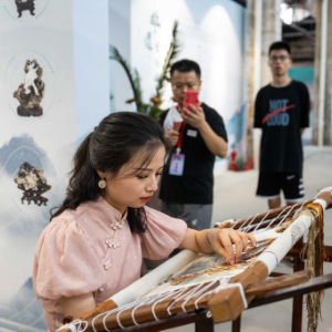 9月21日,在第三届湖南非遗博览会上,参展商在演示麻质画制作。