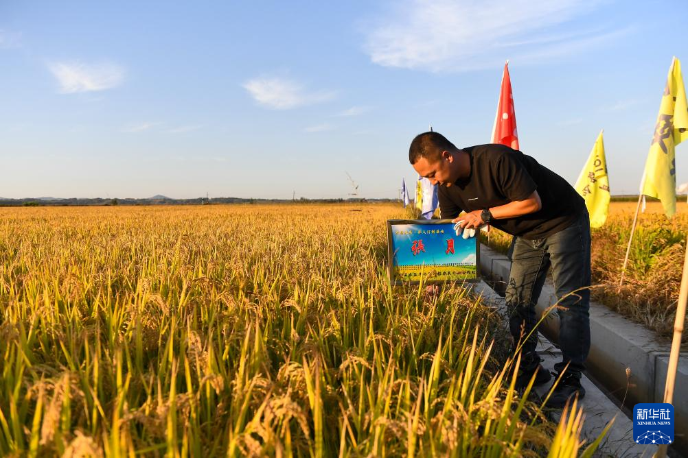 9月20日,在位于吉林省永吉县万昌镇的永吉县禾谷丰水稻种植农民专业合作社,负责人张帅在检查私人订制水稻田标志设施。
