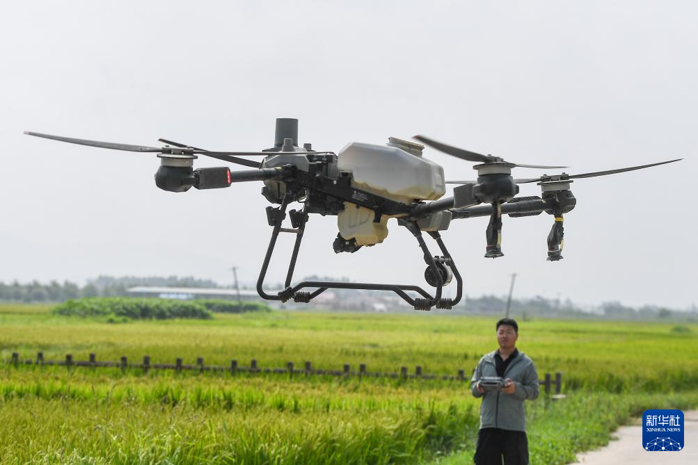 8月20日,在位于吉林省永吉县一拉溪镇的九月丰家庭农场,负责人肖瑶操作植保无人机为水稻施肥。