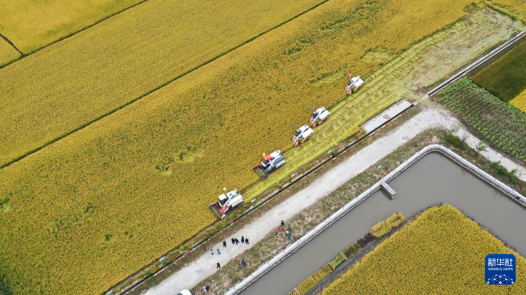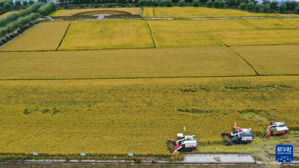 9月20日,在位于吉林省永吉县一拉溪镇的九月丰家庭农场金秋开镰仪式现场,农民驾驶农机进行水稻机械化收割展示(无人机照片)。