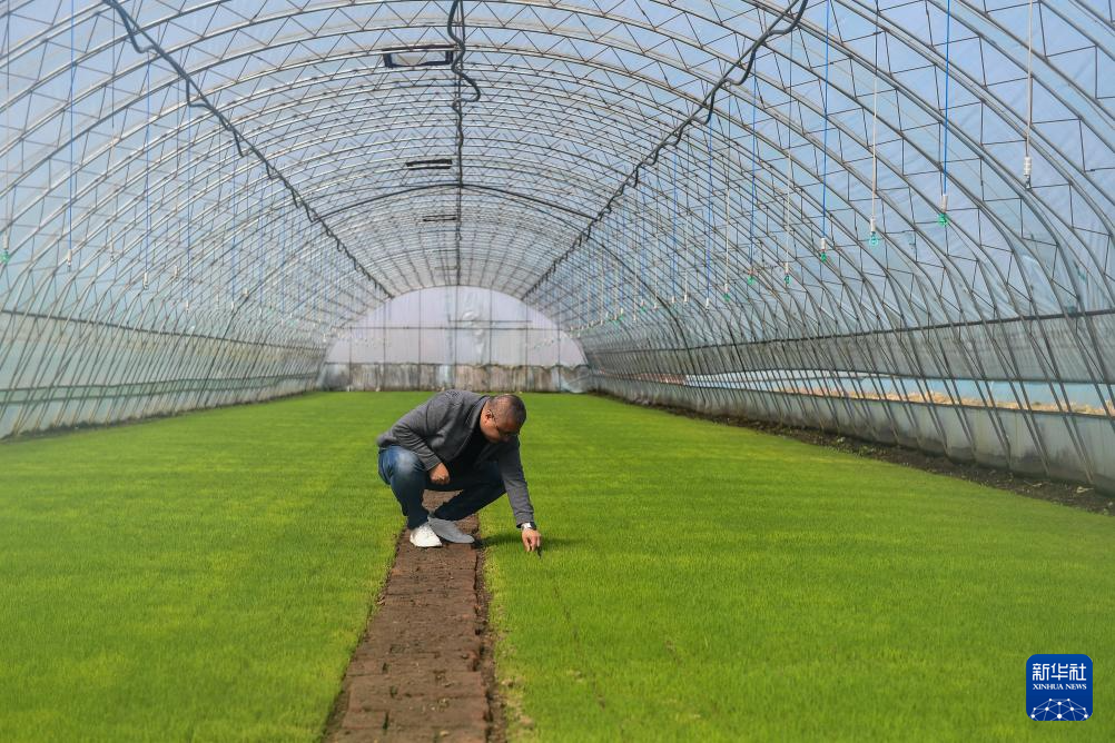 4月17日,在吉林省吉林市永吉县鑫丰种植农民专业合作社,理事长金天在查看水稻育苗情况。