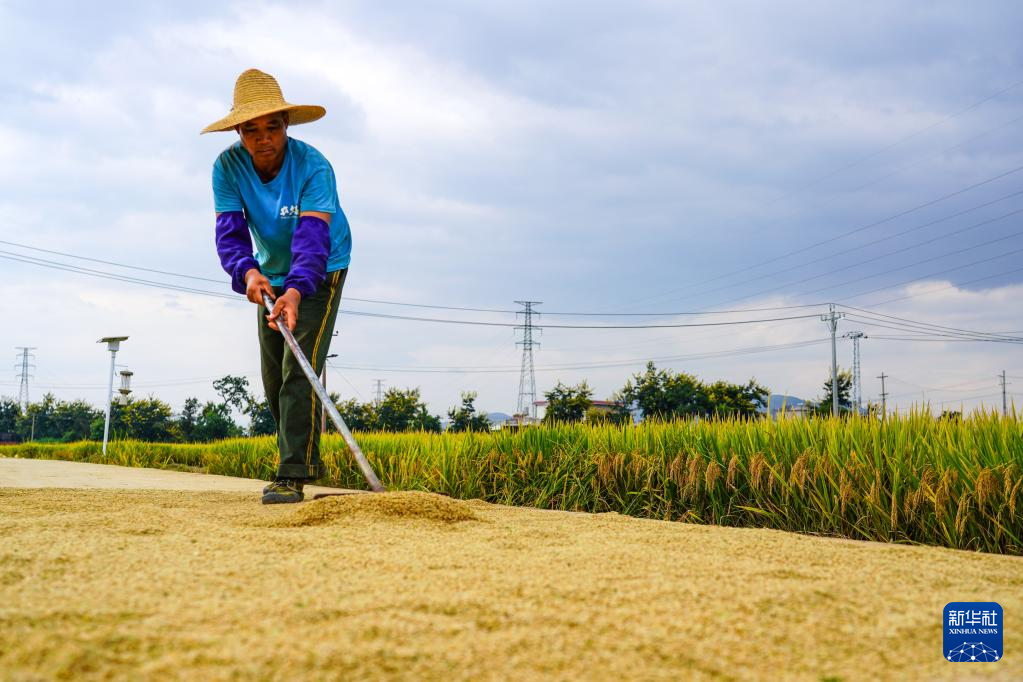 9月20日,在袁隆平超级杂交水稻蒙自示范基地,当地农户在抓紧晾晒稻谷。