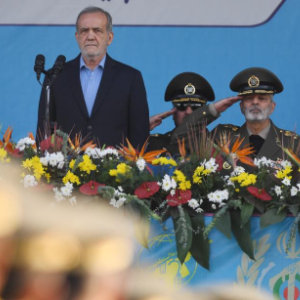 9月21日,在伊朗首都德黑兰,伊朗总统佩泽希齐扬出席阅兵式。