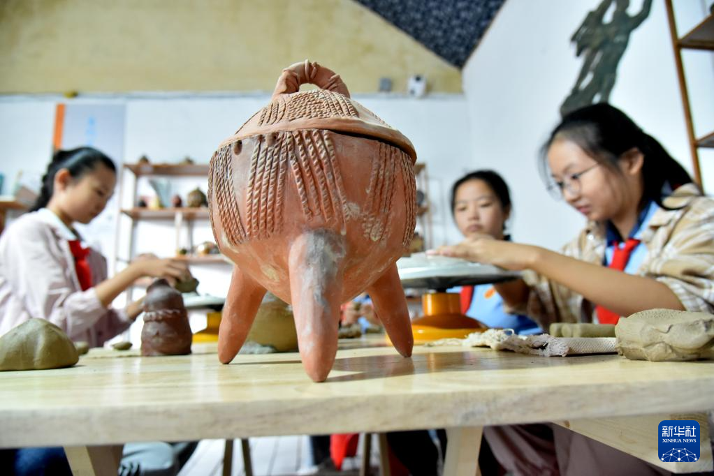 9月21日,在滕州市官桥镇北辛土陶工坊,孩子们在学习制作土陶。