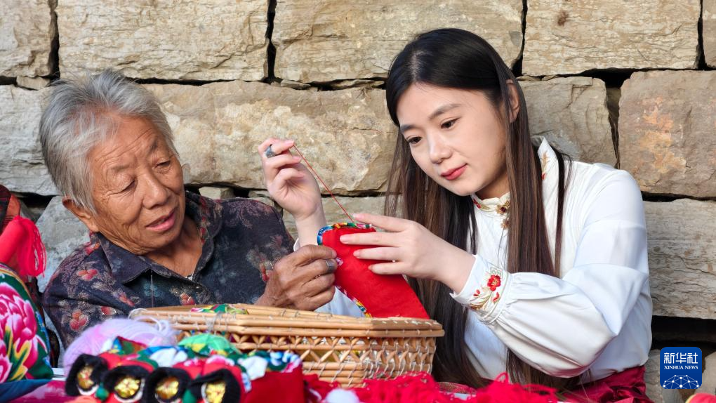 9月21日,在滕州市南沙河镇北古石村,游客向传统手工艺人学习制作虎头鞋。