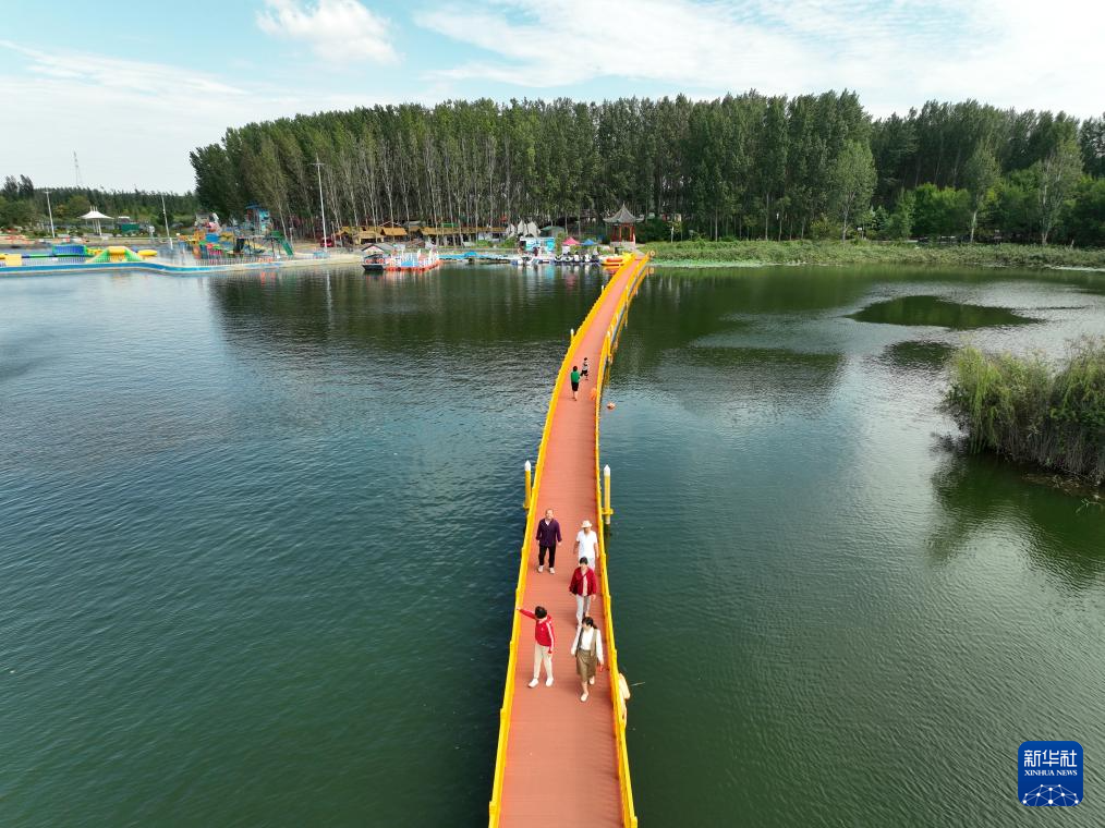 9月21日,游客在滕州市西岗镇九龙湾湿地公园栈道上游玩(无人机照片)。