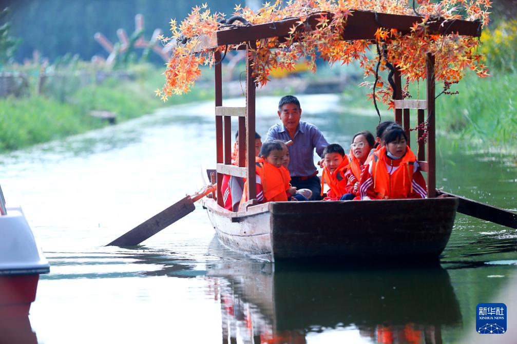9月21日,小学生乘船在滕州市滨湖镇下王村玩耍。
