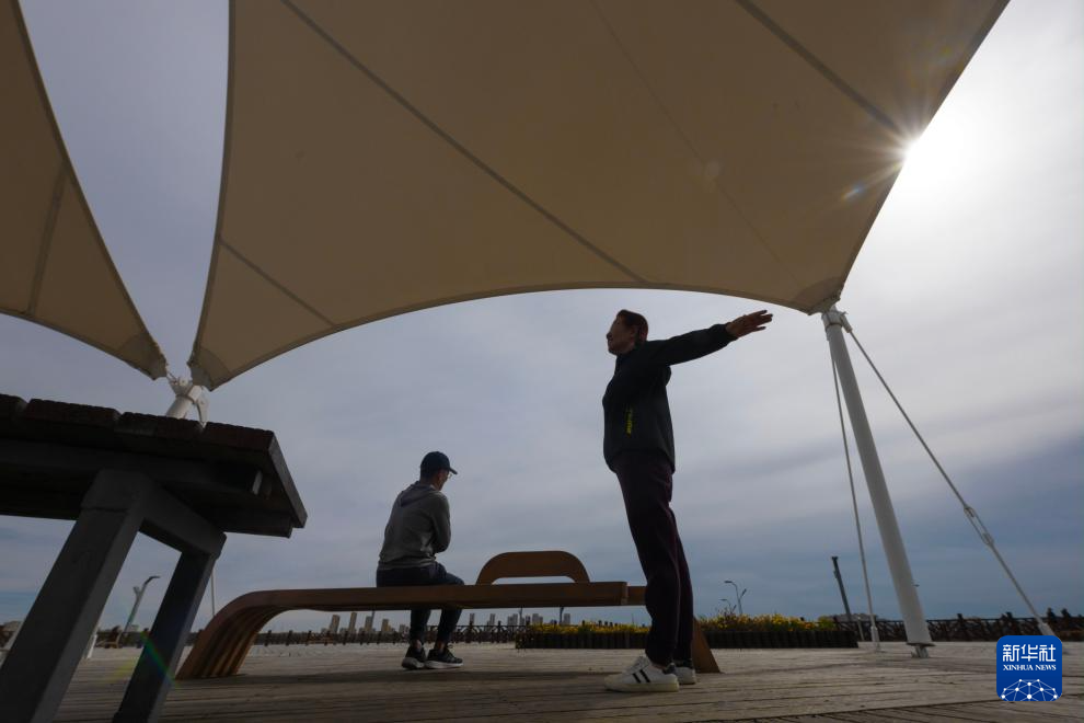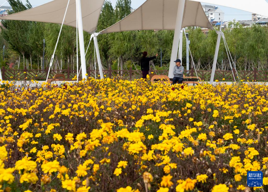 9月20日,市民在大庆市一处滨水绿道休闲(无人机照片)。