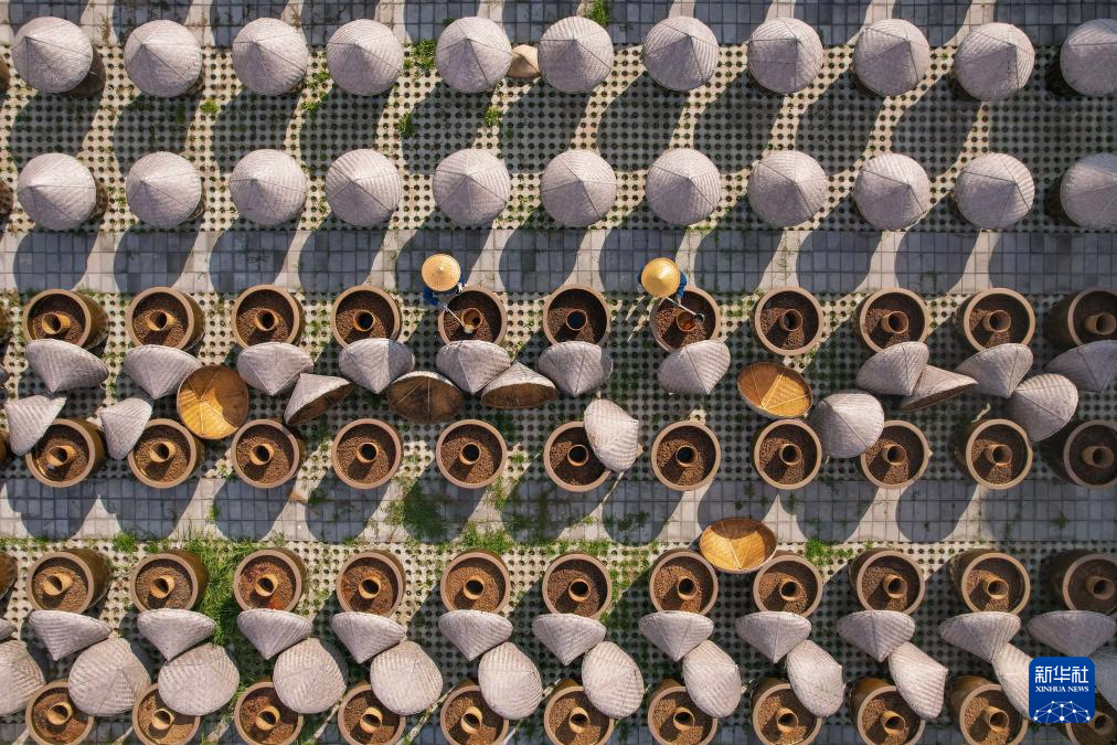 9月21日,滕州市善南街道山东福藤食品有限公司的工人正在进行浇淋酱油作业(无人机照片)。
