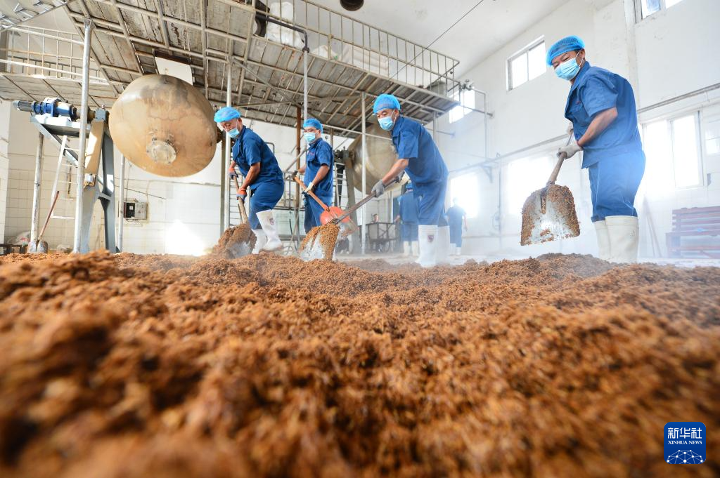 9月21日,滕州市善南街道山东福藤食品有限公司的工人在进行浇淋翻动酱油作业。