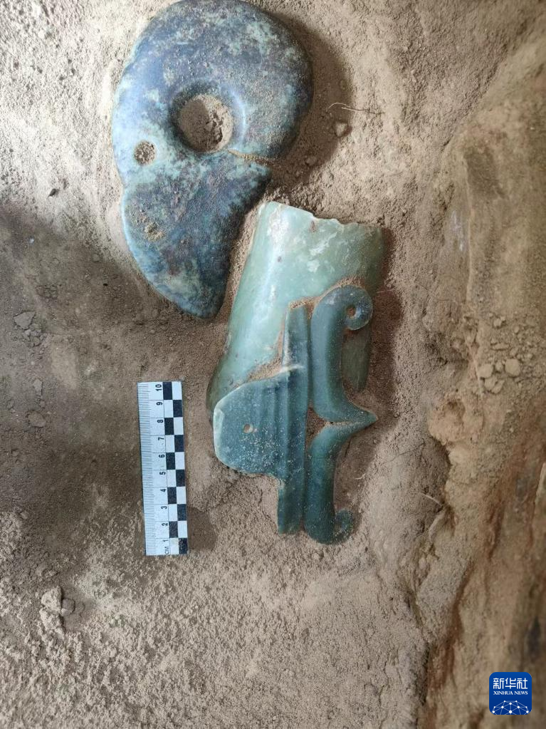 元宝山积石冢遗址随葬玉器出土现场(资料照片)。