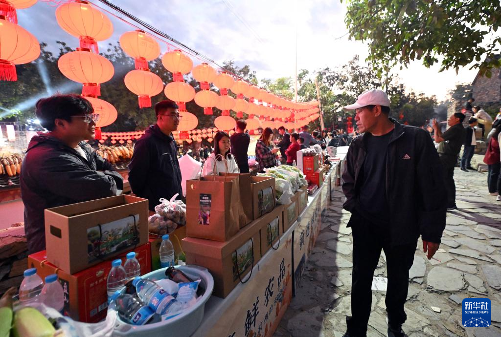 9月21日,游客在天津市蓟州区西井峪村庆丰宴活动现场选购农产品。