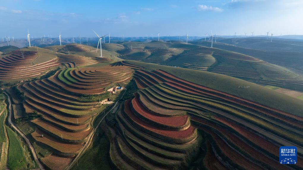 9月21日拍摄的甘肃省庆阳市环县的梯田秋景(无人机照片)。