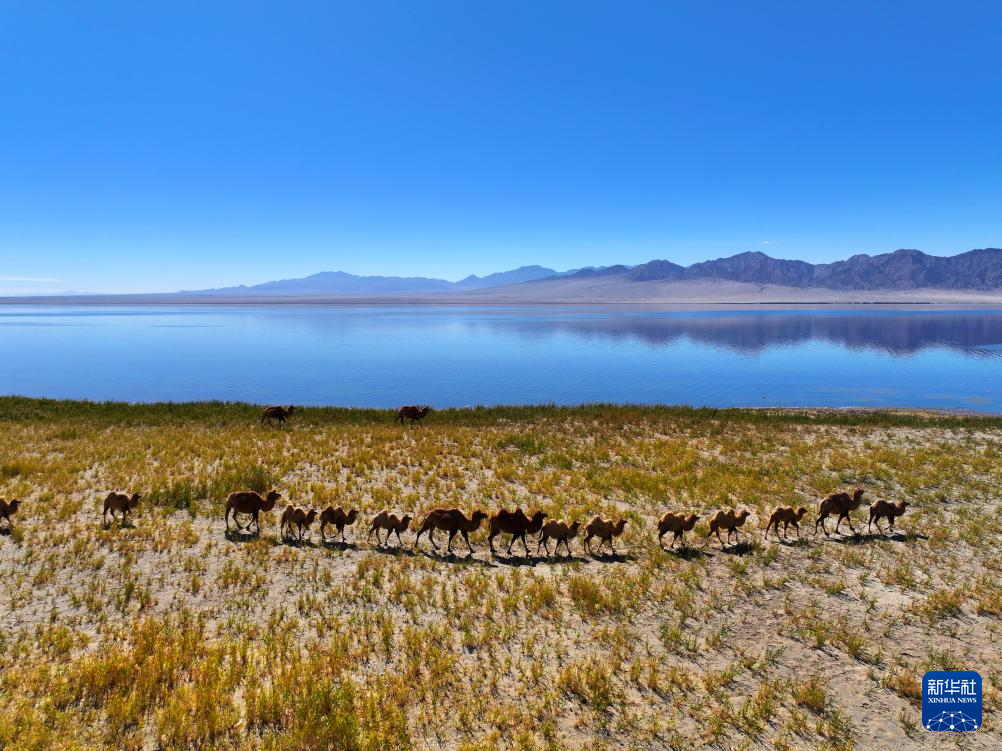 9月21日,一队骆驼行走在甘肃省阿克塞哈萨克族自治县阿伊纳乡的大苏干湖畔(无人机照片)。