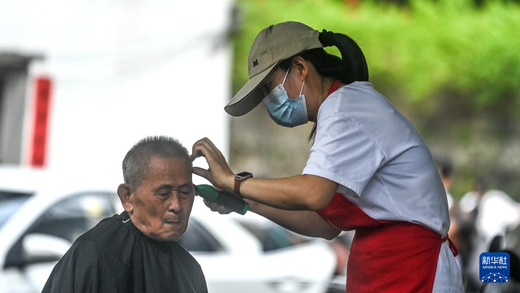 9月22日,青年志愿者(右)在钦州老街给一位老人免费理发。