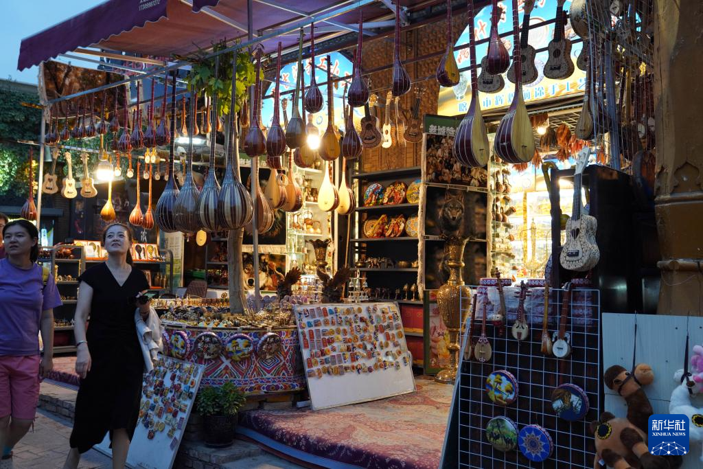 9月19日晚,在新疆喀什古城景区,游客在选购皮包。