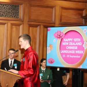 9月23日,在新西兰惠灵顿,当地优秀中文爱好者获奖代表上台致辞。