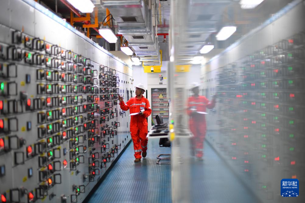 9月17日,在渤海油田曹妃甸6-4油田海上平台,郑建国检查设备流程。新华社发(杜鹏辉摄)