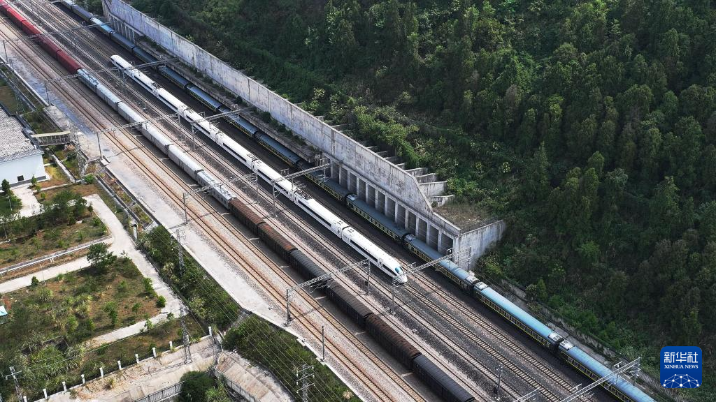 这是一张拼版照片:上图为9月19日,一列高铁列车从禾家村站前的渝厦高铁黔常段隧道中驶出(无人机照片);下图为9月19日,普快列车从禾家村站驶出(无人机照片)。