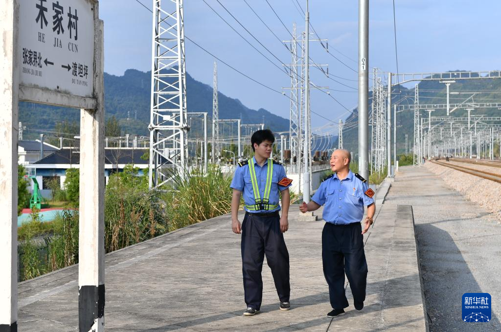 9月19日,59岁的禾家村站值班员程涛(右)与徒弟肖嘉诚在禾家村站站台上交流。