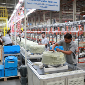9月23日,在埃及斋月十日城,工人在海尔埃及生态园一期项目的洗衣机生产线上工作。