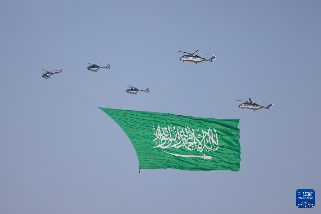 9月23日,直升机编队悬挂沙特国旗在利雅得上空飞行。