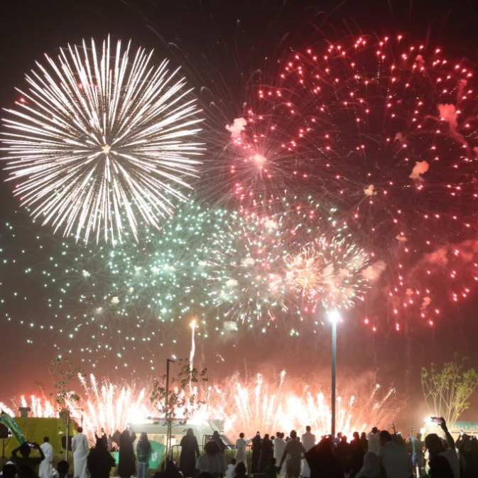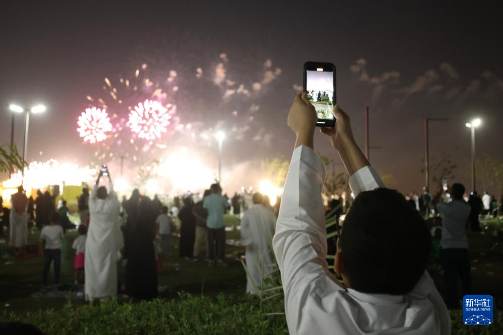9月23日,人们在沙特阿拉伯首都利雅得拍摄烟花秀。